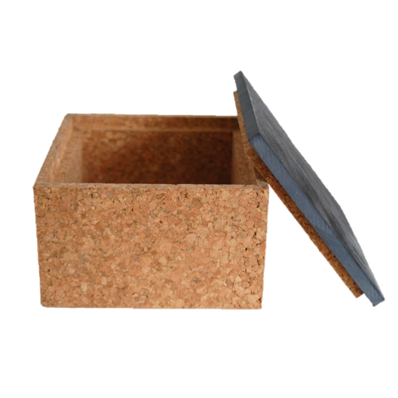 Denna box är av ljus kork med tillhörande lock i svart granit.
